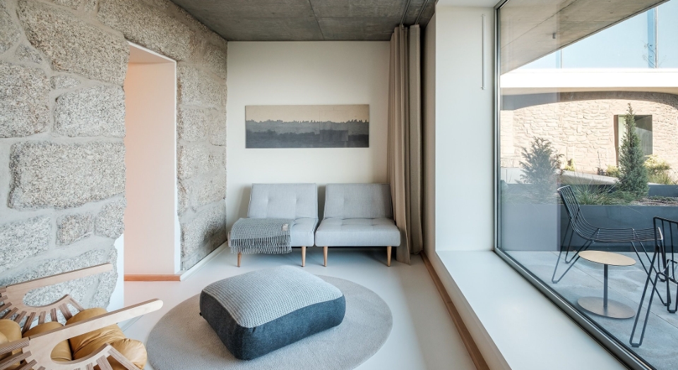 Originally a simple construction in granite and schist stone, with long eave roofs, Casa de São Lourenço has been enlarged and augmented by architects Paulo Costa and Patrícia Marques through the artful use of masonry and stone. Noteworthy is a new concrete construction that opens up to the south and overlooks the valley, giving the hotel more breadth, as well as a canvas for contemporary design.