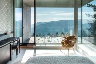The stone and wood building was restored with large windows and wide terraces, connecting one to the mountain scenery.